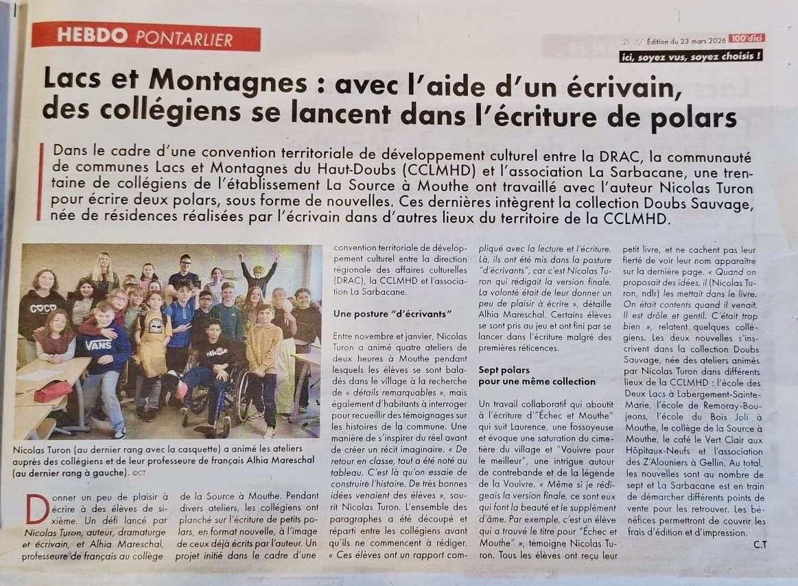C’est dans le cadre d’un CTEAC (Convention Territoriale pour l’Enseignement Artistique et Culturel) que je lance pas moins de 8 chantiers d’écriture participatifs dans différentes structures scolaires et associatives situées à Mouthe ou aux alentours :