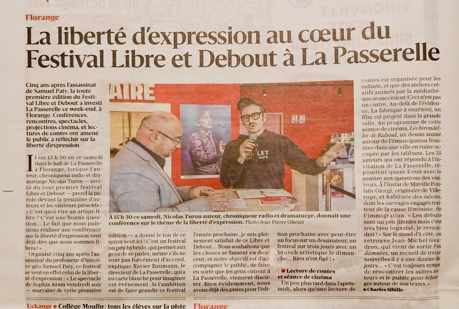 Il est 15 h 30 en ce samedi dans le hall de La Passerelle à Florange, lorsque l’auteur, chroniqueur radio et dramaturge Nicolas Turon — invité du tout premier festival Libre et Debout — prend la parole devant la trentaine d’auteurs et les visiteurs présents : « C’est quoi être un artiste libre ? C’est une bonne question… Le fait que nous puissions réaliser une conférence sur la liberté d’expression veut déjà dire que nous sommes libres ! »
